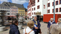 Heute erwartet uns Chemnitz. Wir starten unseren Stadtrundgang vor dem Alten Rathaus. Herr Eberhard Fiebig startet als erstes mit dem Brunnen „Manifold“, welcher aus vier bis zu 2,80 Meter hohen, kreiselförmigen Edelstahlskulpturen mit spiegelnden Oberflächen besteht. Diese abstrakten Formen erinnern sowohl an Maschinenteile als auch an menschliche Figuren und laden zur Interpretation ein. Manch einer fühlt sich auch an einen Stapel Alu-Felgen erinnert.