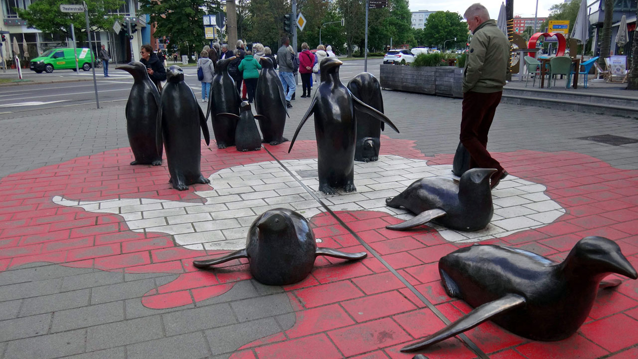 Wenig später treffen wir auf die „Pinguinkolonie“ von Peter Kallfels, sie umfasst 14 Kaiserpinguine, zu sehen innerhalb der Umrisse der Antarktis und der Stadt Chemnitz. Unweit davon ist das bekannteste Wahrzeichen von Chemnitz zu erkennen: Der Karl-Marx-Kopf oder auch im Volksmund liebevoll „Nischel“ genannt. „Nischel“ ist ein mitteldeutscher Begriff für „Kopf“ oder „Schädel“ und spiegelt die regionale Verbundenheit der Bevölkerung mit dem Monument wider.